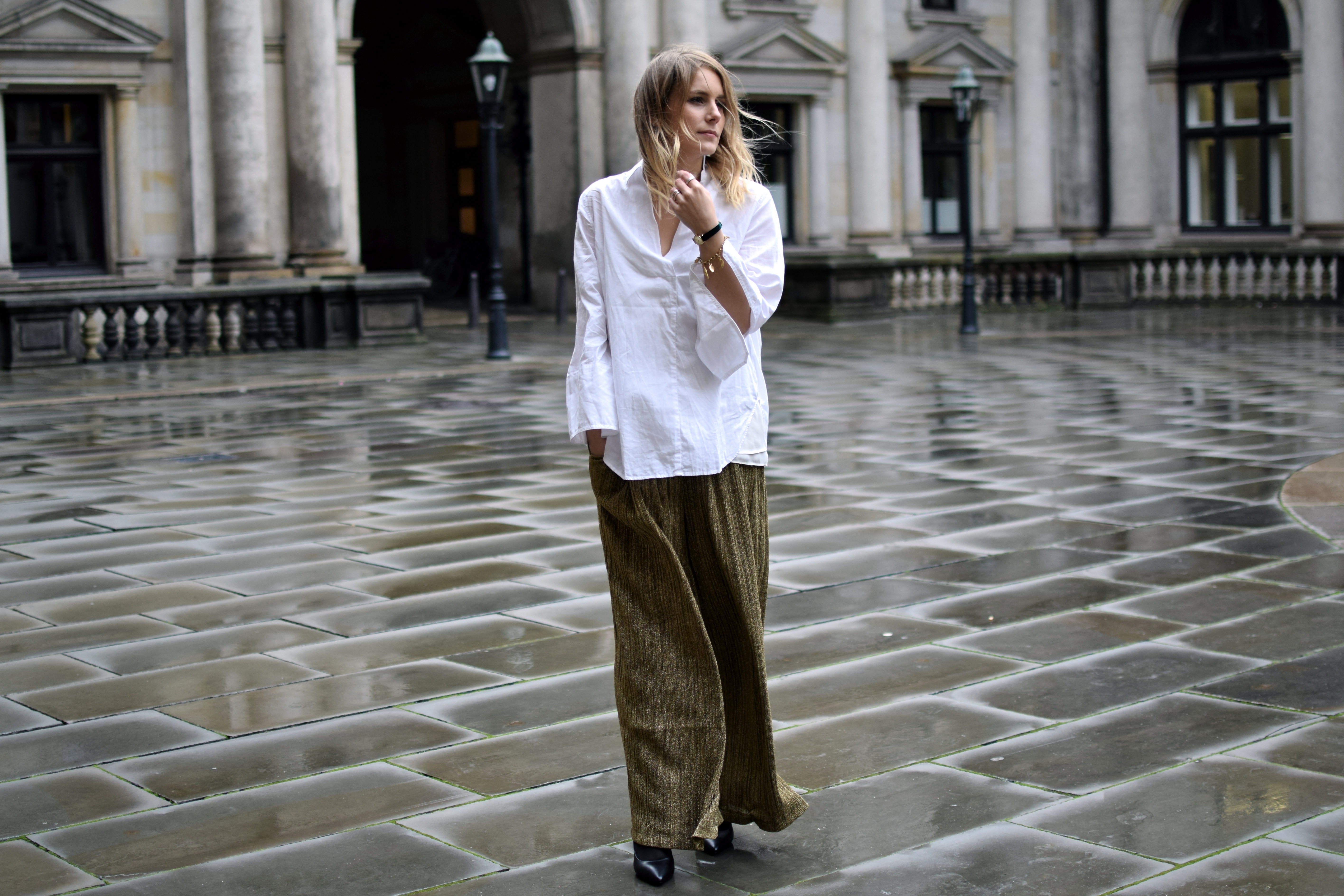 goldene Plisseehose und weiße Bluse